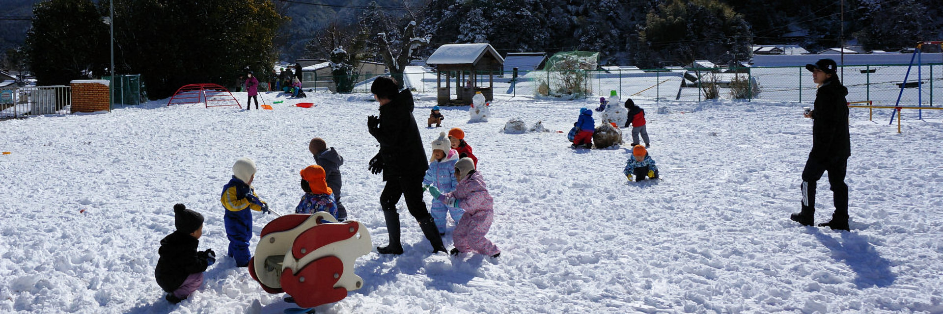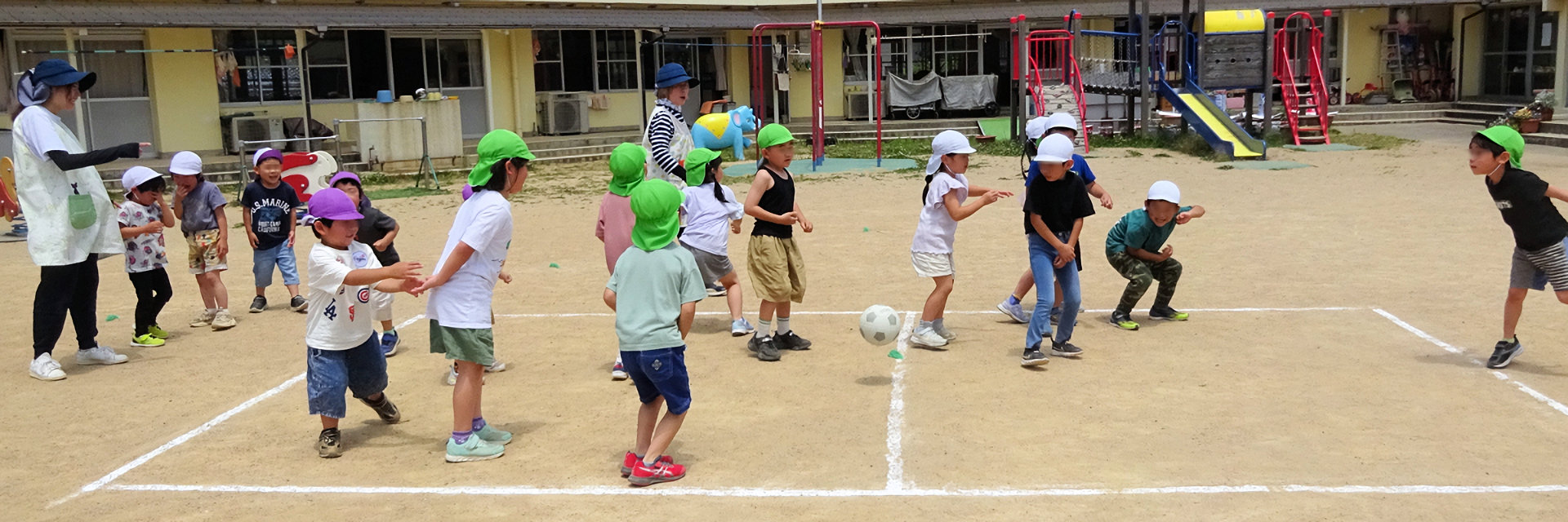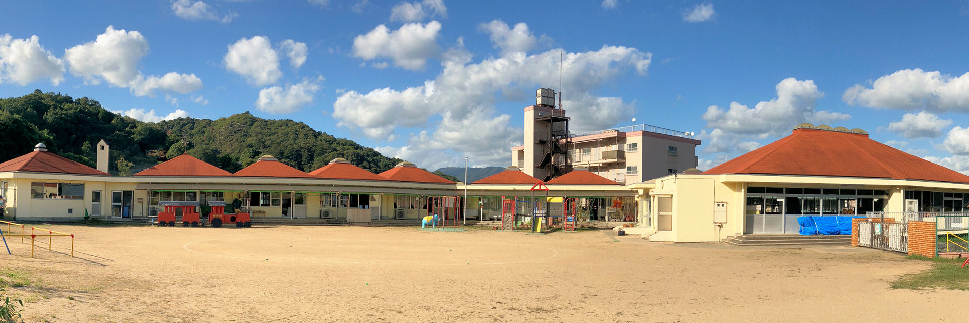 緑に囲まれた、小高い丘にあります。ひろーい園庭を子どもたちが元気にかけまわりみんな揃ってランチルームで食事。子どものつぶやきに心が和むアットホームな保育園です。